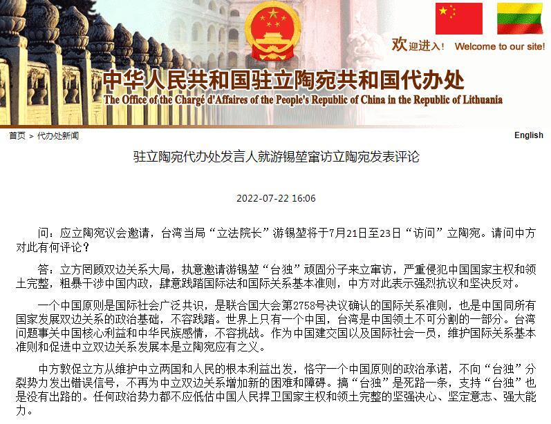 中国驻立陶宛代办处发言人就游锡堃窜访立陶宛发表评论
