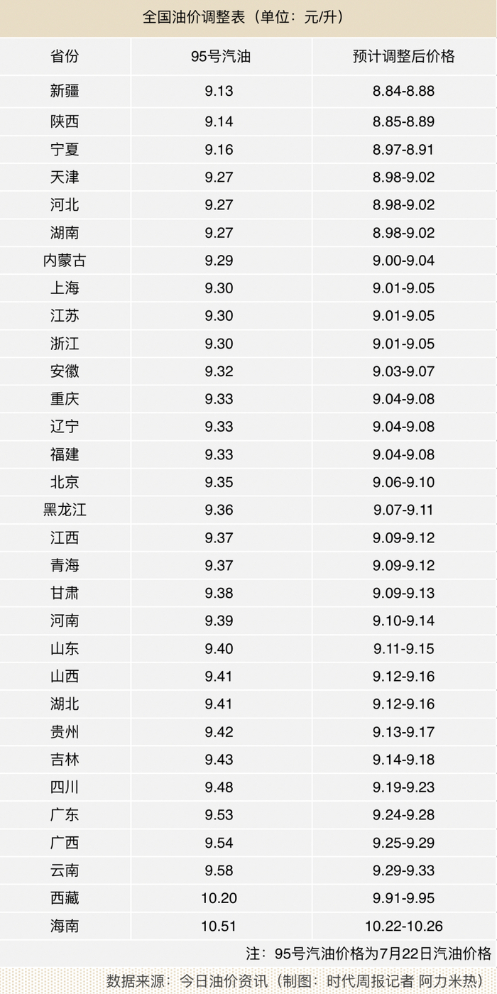 以7月22日成品油零售价为例,陕西、宁夏、新疆地区的95号汽油零售价分别为9.14元/升、9.16元/升、9.13元/升,是全国范围内价格最低的三个地区。