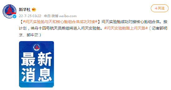 问天实验舱与天和核心舱组合体成功对接
