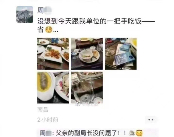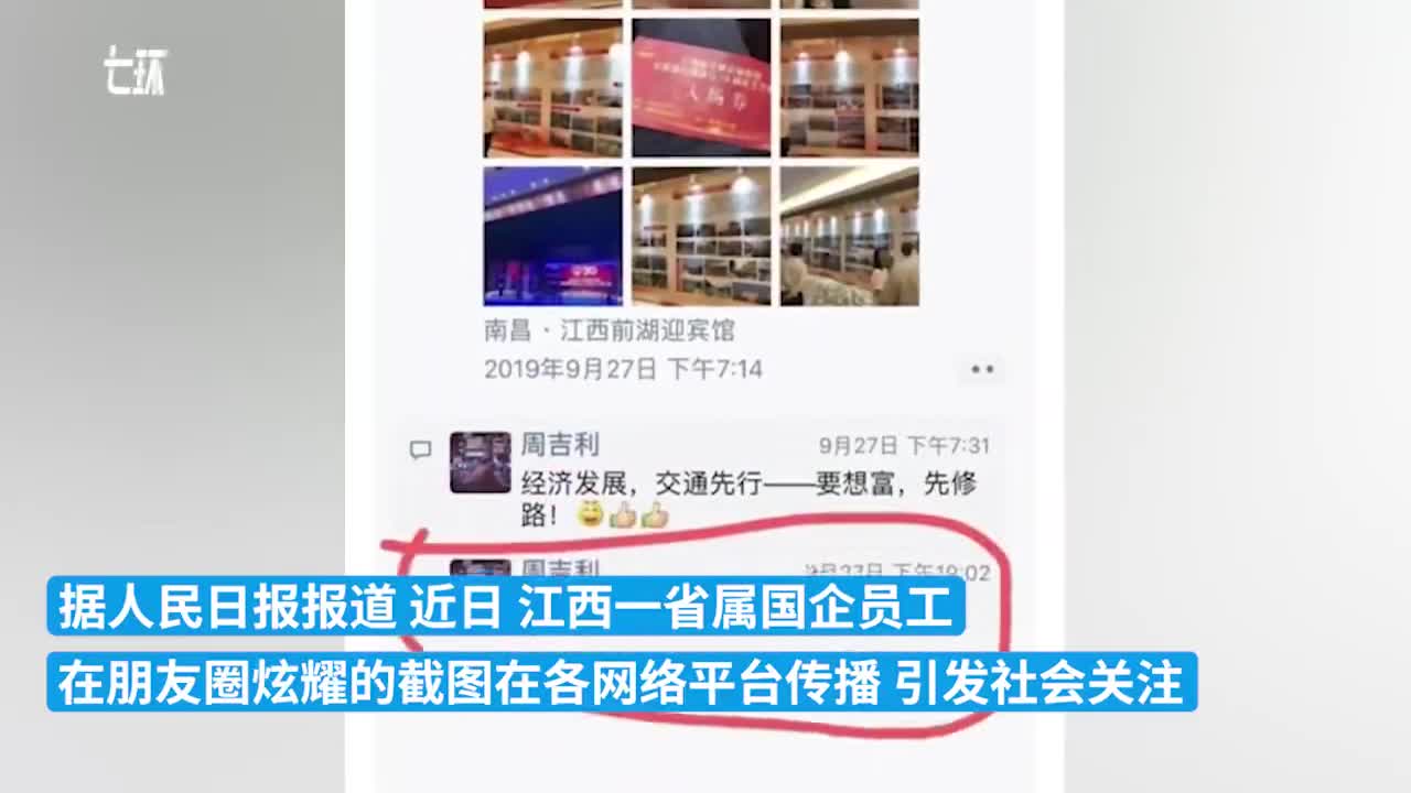 7月24日,一位江西男子周某在朋友圈炫富之事引发舆论关注。网友提供的其微信朋友圈截图显示,周某自称在江西省国有资本运营控股集团有限公司(下称江西国控公司)上班,其父母为处级干部。周某在朋友圈自称,自己经常参与多位厅级、处级干部的饭局,也曾参与接待会见省内一些上市公司、国有企业的一把手。