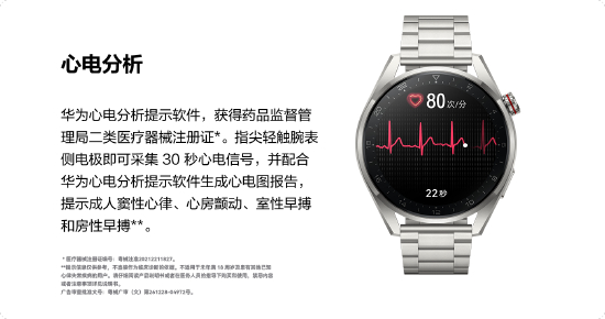 华为运动健康军团CEO、华为终端BG智能穿戴与运动健康产品线总裁张炜表示:自2020年以来,华为智能穿戴业务在国内已经取得了四张医疗器械注册证。华为WATCH 3 Pro new新增ECG心电分析,华为心电分析提示软件,获得药品监督管理局二类医疗器械注册证* (*医疗器械注册证编号:粤械注准20212211827)。指尖轻触腕表侧电极,采集 30 秒心电信号,配合华为心电分析提示软件生成心电图报告,提示成人窦性心律、心房颤动、室性早搏和房性早搏,帮助用户了解心脏健康状态。