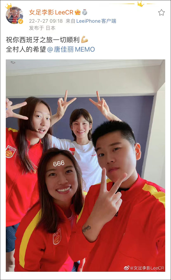 27日上午,女足国脚李影在社交媒体发布与队友的合照,并配文祝福唐佳丽“西班牙之旅一切顺利”。