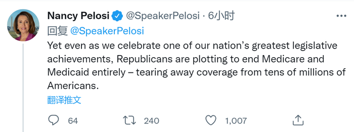 佩洛西称,“57年前,美国从根本上改变了我们照顾我们社会中最弱势成员的方式。自约翰逊总统签署医疗保险和医疗补助成为法律以来的几十年里,它们一直是美国人健康、安全和正义的支柱。然而就在我们庆祝我们国家最伟大的立法成就之一的时候,共和党人却在密谋彻底终止医疗保险和医疗补助计划——剥夺数千万美国人的医疗保险。”