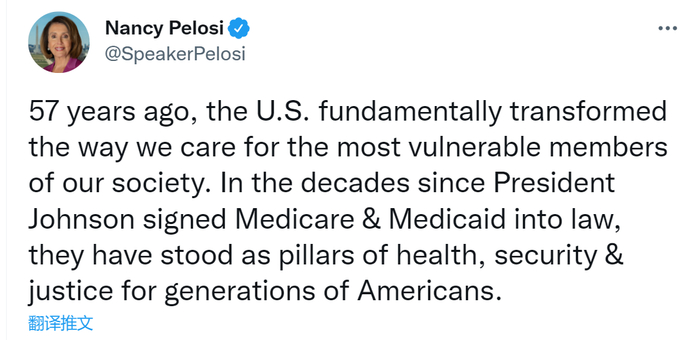 其声明称,在1965年7月30日约翰逊总统签署的联邦医疗保险和联邦医疗补助57周年纪念日到来之际,众议院议长南希·佩洛西发表声明。