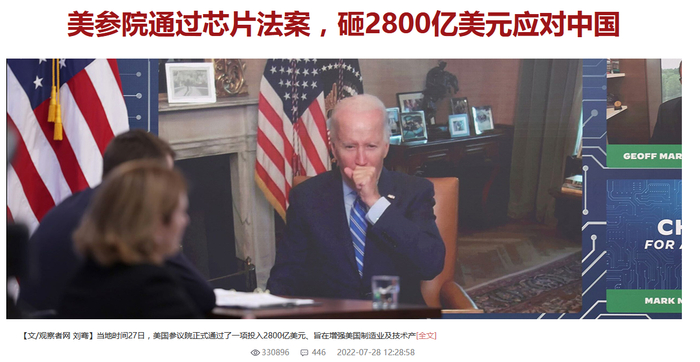 问:就在中美领导人通话的前一天,美国参议院通过了规模达2800亿美元的“芯片与科学”法案,声称要让芯片回归美国,拜登甚至带病“上线”推销这部法案。我们应该如何看待这部法案?