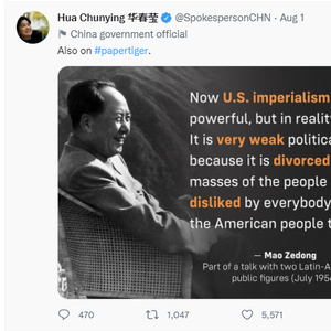 8月1日上午,外交部发言人华春莹在推特上引用毛泽东语录:“现在美帝国主义很强,不是真的强。它政治上很弱,因为它脱离广大人民,大家都不喜欢它,美国人民也不喜欢它。”华春莹同时表示,“(美国)就是纸老虎。”