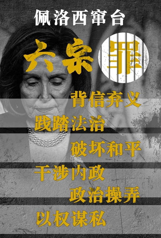 佩洛西此行犯下背信弃义、践踏法治、破坏和平、干涉内政、政治操弄、以权谋私六宗罪,必将受到历史公正的审判和清算。