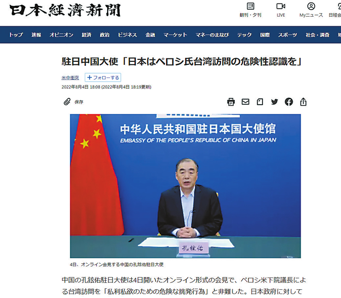 《日本经济新闻》 网站5日报道截图: 中国驻日本大使孔铉佑4日在东京举行专场记者会, 就佩洛西窜访中国台湾地区等全面阐明中方严正立场。