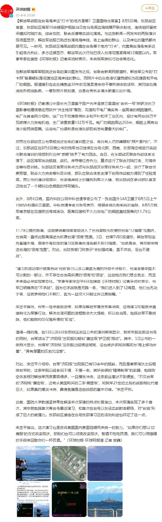 [解放军战舰在台岛海岸边“打卡”的地方是哪?卫星图给出答案]8月5日晚,东部战区官宣,东部战区海军10余艘驱护舰艇当日在台岛周边海域展开联合封控,连续组织昼夜间模拟对陆打击、综合攻防、联合反潜等实战化演练。与这条新闻一同发布的两张演训现场图显示,解放军战舰已贴近台湾岛海岸线,岛上连绵的群山,以及岸边的建筑都肉眼可见。一时间,东部战区海军战舰究竟在台岛哪个地方“打卡”,究竟离台湾岛有多近引起各方热议,多方证据显示,解放军此次行动已深入台湾花莲某海域12海里以内。军事专家在接受《环球时报》记者采访时表示,未来我军类似行动会常态化。
