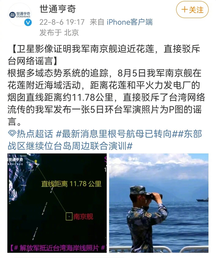 此外,8月6日晚,国内科技公司中科世通亨奇公布了一张由国外SAR卫星于8月5日上午10时许拍摄的卫星图。中科世通亨官方账号表示,根据多域态势系统的追踪,8月5日我军南京舰在花莲附近海域活动,距离花莲和平火力发电厂的烟囱直线距离约11.78公里。