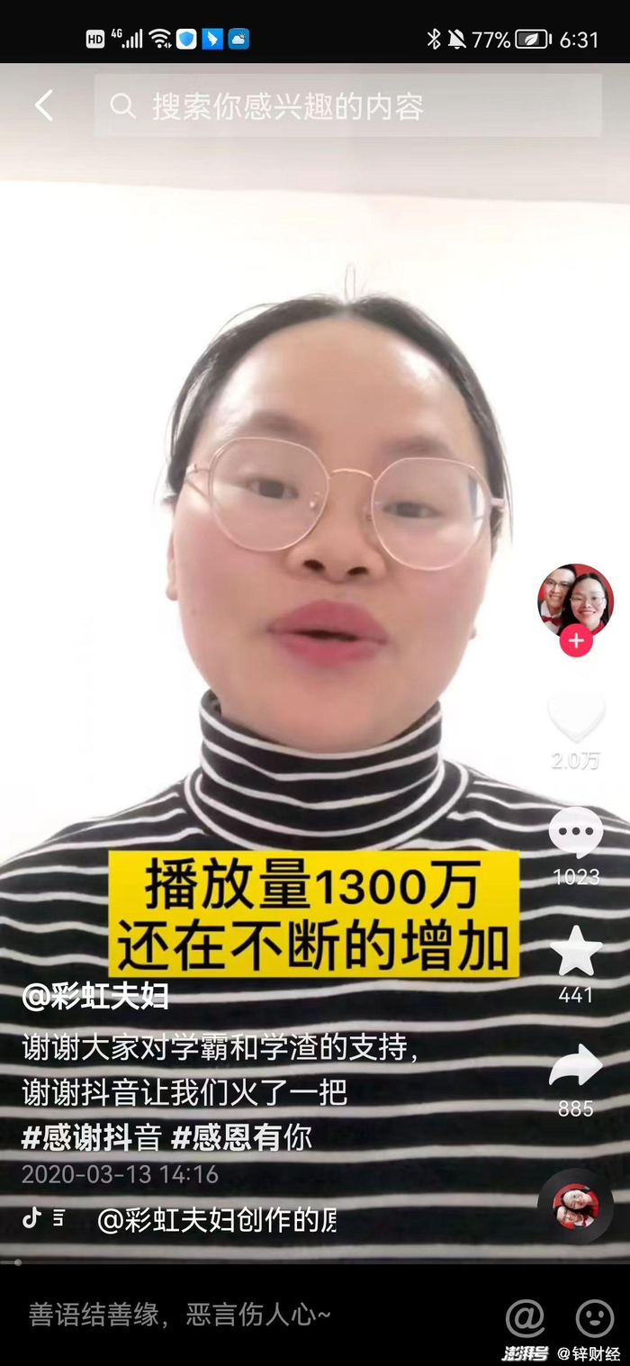 2020年3月,“彩虹夫妇”在抖音首次发布了一条回顾奋斗史的视频,其中上述的各种逆袭桥段引起了观众的共鸣,纷纷表示了“感动、励志”,视频播放量也直接冲上了1300万。而在此之前,他们纪录日常生活的视频一直不温不火。