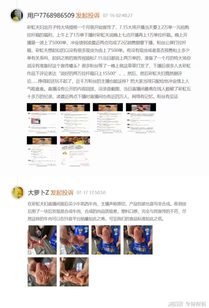 卖鸡汤或是卖货,其实也没什么,不过都是各取所需。但锌财经在黑猫投诉上却发现,贫寒出身的“彩虹夫妇”对自己的观众们,并不那么厚道,不乏有”虚假宣传“、”货不对板“等投诉问题出现。