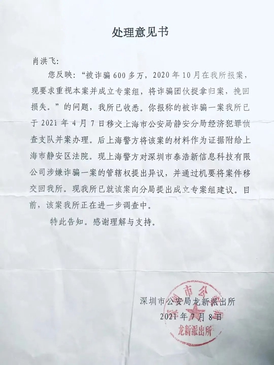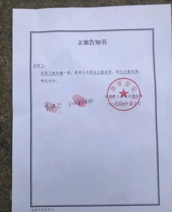 肖洪飞:公安机关早在2年以前就已经与以诈骗立案了,并于去年成立了专案组,因为性质有点恶劣。在我的努力下,目前警方启动了最高规格案件处理,有刑侦,经侦等多部门联合介入,就在早两天,深圳龙岗分局和龙新派出所相关负责人约谈了我,承诺加快侦办这个案件,该抓的抓,将犯罪团伙绳之以法。