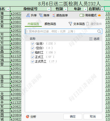 8月6日,记者拿到了一份当日送往荆门二医院检测的人员名单,名单上共有232人,除十余名未登记年龄外,其他人员最小的仅16岁,最大的已经53岁。其中有2名员工未登记在职状态,剩余230人中,有临时工156人,正式员工仅74人。临时工人数远超正式工。