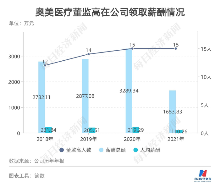 2020年,奥美医疗同样是披露了15名董监高成员,他们当年合计获得的报酬是3289.34万元,人均接近220万元;2019年14名董监高合计薪酬为2877.08万元,2018年12名董监高合计报酬2782.11万元,人均同样200万元以上。