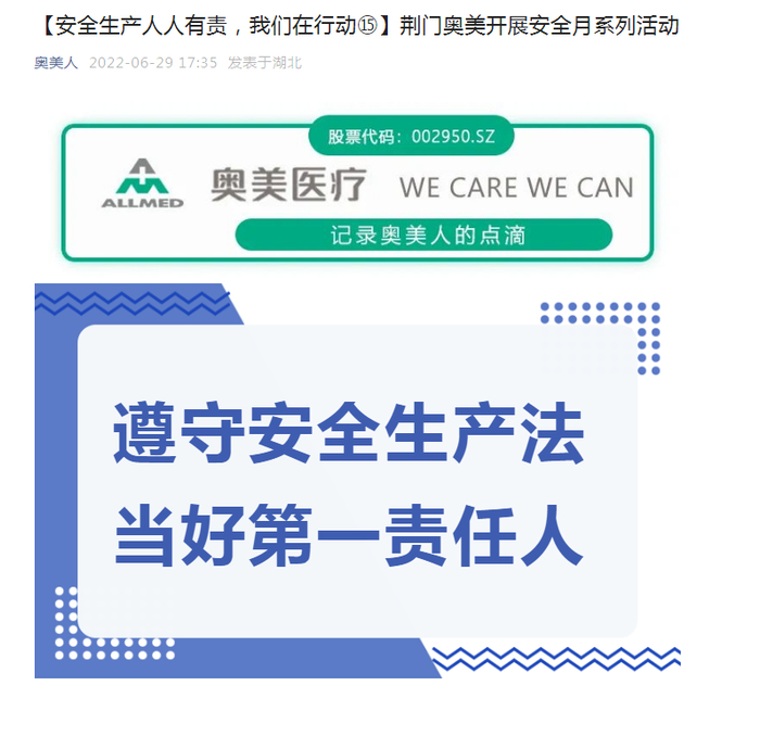 奥美医疗官方公众号“奥美人”6月29日发布名为《[安全生产人人有责,我们在行动⑮]荆门奥美开展安全月系列活动》文章,其中提及,6月1日,荆门奥美各层级管理人员、员工代表共同参加启动会仪式。