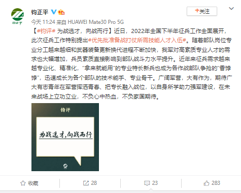 近日,2022年全国下半年征兵工作全面展开,此次征兵工作特别提出优先批准备战打仗所需技能人才入伍。随着部队岗位专业分工越来越细和武器装备更新换代进程不断加快,我军对高素质专业人才的需求也大幅增加,兵员素质直接影响到部队战斗力水平提升。近年来征兵需求越来越专业化、精准化,“拿来就能用”的专业特长新兵也成为各作战部队争抢的“香饽饽”,迅速成长为各个部队的技术能手、专业骨干。广阔军营,大有作为,期待广大有志青年在军营挥洒青春、把专长融入战位,以自身所学助力强军建设,在未来战场上立功立业,不负心中热血,不负家国期待。