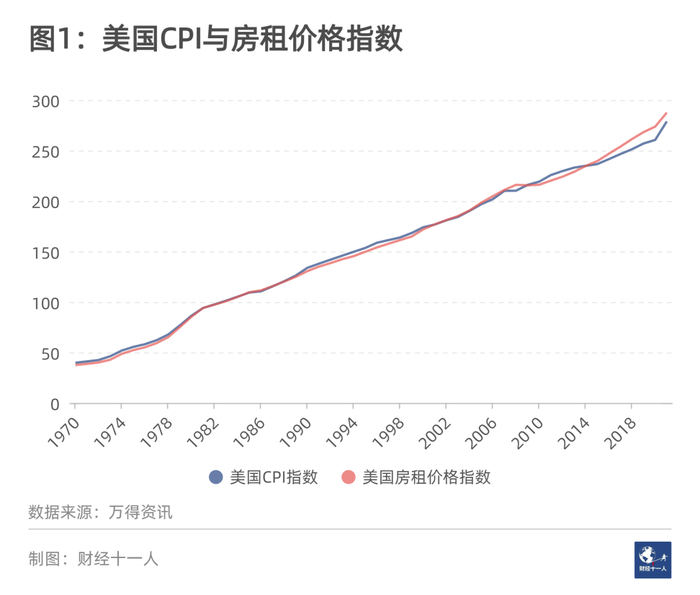 先介绍一个规律:从长期看,房租涨幅与通胀同步。图1展示了美国的CPI指数和房租价格指数。不难看出,在长达50年的时间里,两者涨幅基本一致。