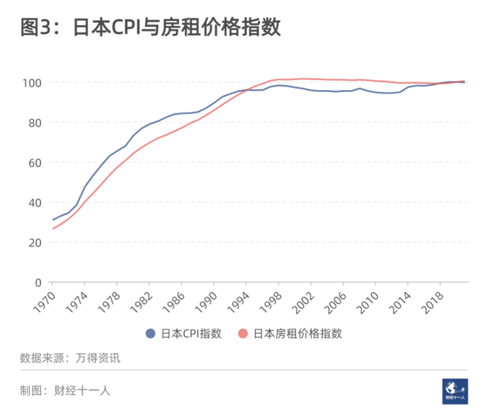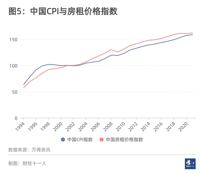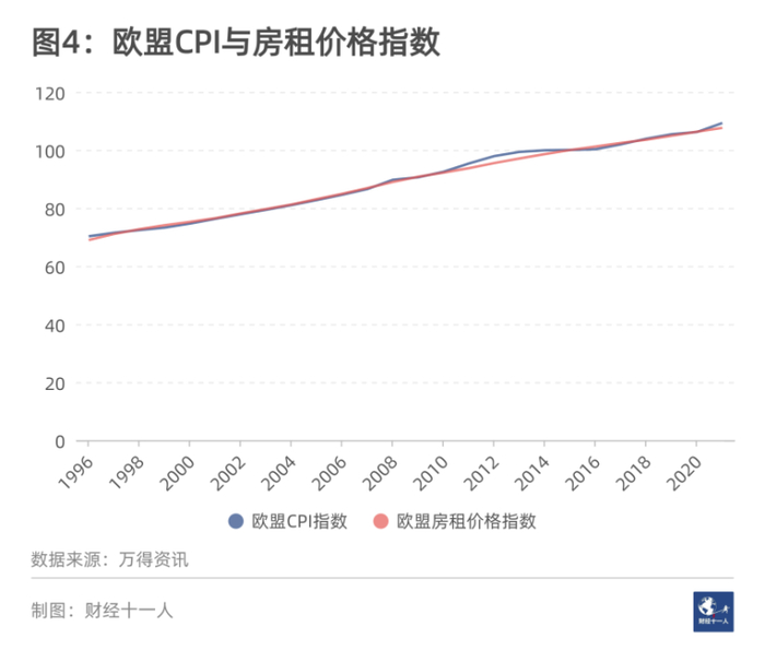 和美国数据一样,日本、欧盟、中国的相关数据都显示,在比较长的时间内,CPI指数增幅和房租价格指数增幅基本一致。