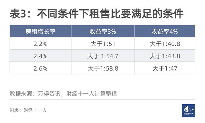 所以,需要分析的是,在某城市住宅租金年涨幅分别为2.2%、2.4%、2.6%三种情况,要达到3%和4%的投资收益率,租售比需要满足什么条件。