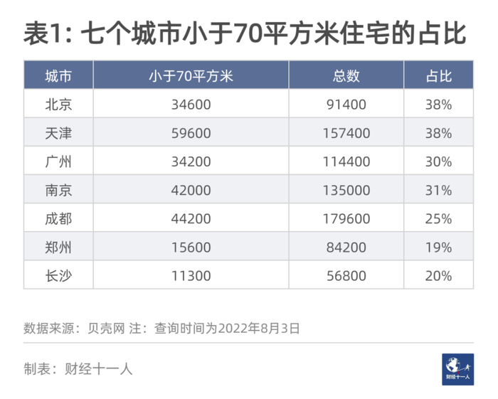 表1显示,在贝壳网(BEKE.N)挂牌的很多城市的二手房中,都有相当比例的房子建筑面积不足70平方米。