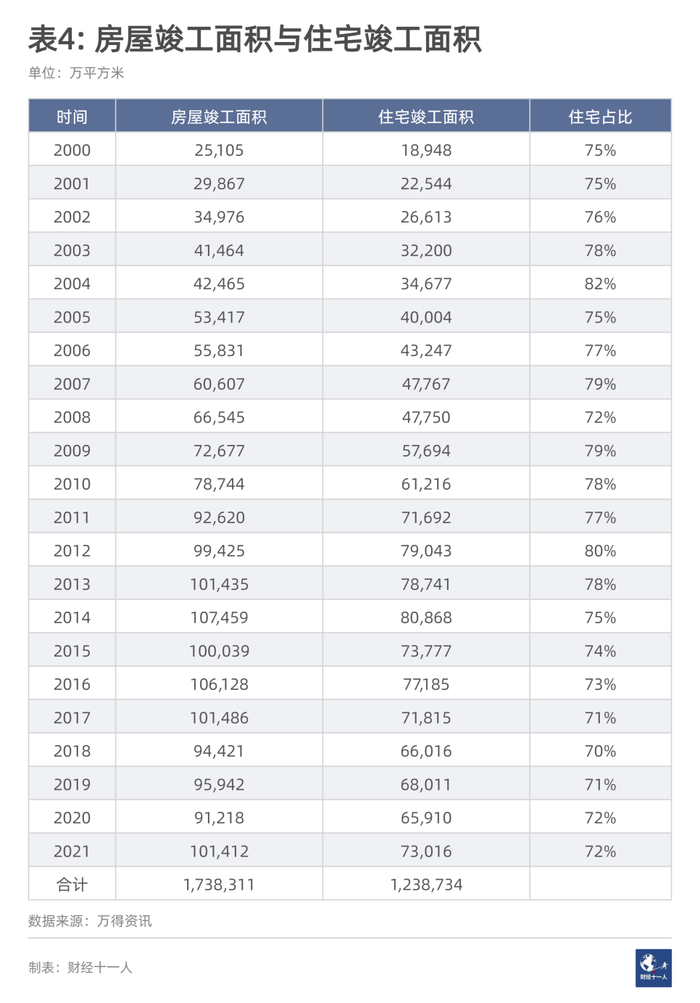 我们根据相关数据推算,1995年-2021年竣工的商品住宅总面积约为130.7亿平方米。因此,中国城镇住宅中仅有不到40%是建于1995年之后的商品房(具体测算见尾注1)。