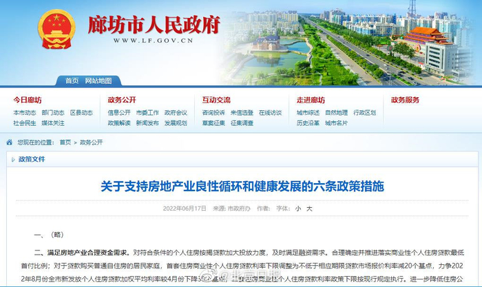 记者查询发现,2022年6月17日,廊坊市政府官网曾公布《关于支持房地产业良性循环和健康发展的六条政策措施》。只不过,当时第一条措施并未对外公布,而是“略”过。