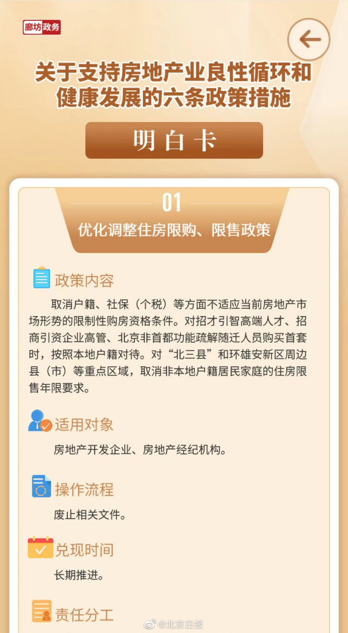 对比此前公布的政策,在满足房地产业合理资金需求方面,政策明白卡还公布更多“合理满足房地产开发企业开发贷款需求”的内容:银行业机构要按照依法合规、风险可控、商业可持续原则,区分优质项目和房地产企业集团风险,对风险可控、担保充分的项目给予开发贷款支持。做好重点房地产企业风险处置项目并购金融服务,重点支持优质房地产兼并收购出险和困难大型房地产的优质项目,合理确定融资期限,提高融资效率。对兼并并购出险和困难房地产企业项目的并购贷款暂不纳入房地产贷款集中度管理。(北京日报记者 孙杰 图片来源:廊坊市政府官网截图)