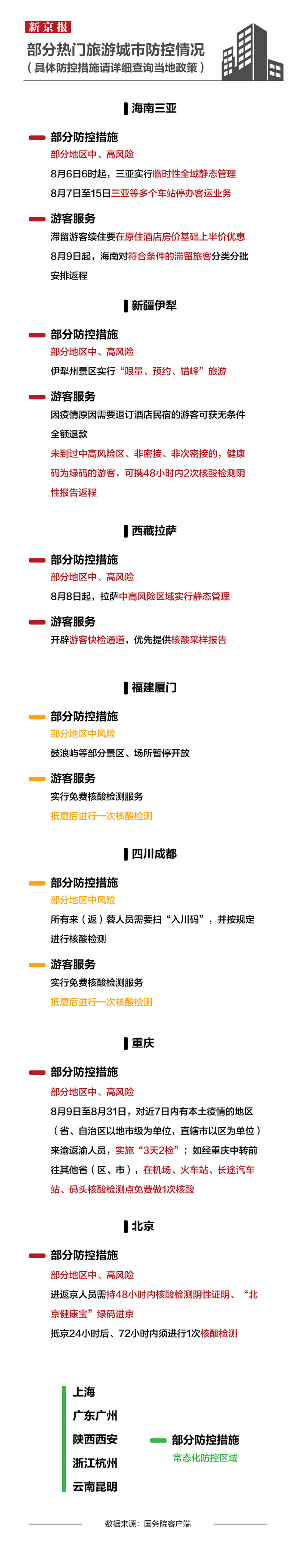 今年暑期,新疆旅游“出圈”。官方数据显示,本轮疫情发生以来,7月30日至8月7日,新疆累计接待游客约882万人次,日均接待游客98万人次。目前,新疆疫情仍处于快速发展阶段,为尽快阻断疫情传播蔓延,防范疫情风险外溢扩散,伊犁州景区实行“限量、预约、错峰”旅游,乌鲁木齐市重点城区8月10日起实行临时性静态管理措施。针对需要返程的游客,新疆维吾尔自治区文化和旅游厅介绍,对未到过中高风险区、非密接、非次密接的,健康码为绿码的游客,可携48小时内2次核酸检测阴性报告返程;对于因为疫情原因需要退订酒店民宿的游客,各经营企业不得以“预付款不退”或“扣除定金”等名义拒绝相关要求,要无条件全额退款。
