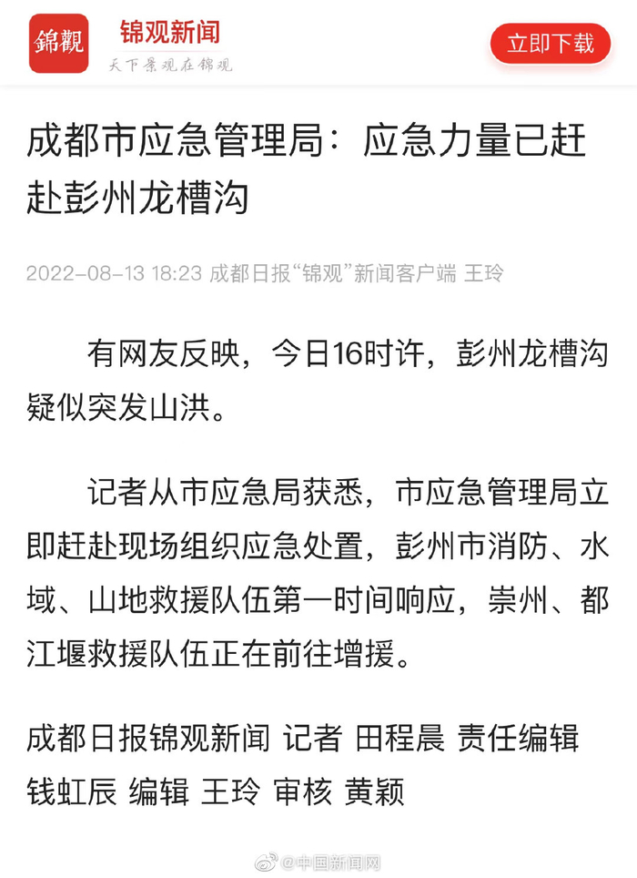 [#应急力量已赶赴四川彭州龙槽沟#] 据成都日报锦观新闻消息,有网友反映,今日16时许,彭州龙槽沟疑似突发山洪。记者从市应急局获悉,市应急管理局立即赶赴现场组织应急处置,彭州市消防、水域、山地救援队伍第一时间响应,崇州、都江堰救援队伍正在前往增援。