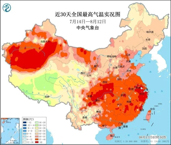 8月12日当天,华北南部至江南及四川盆地、陕西中南部、内蒙古西部等地出现35℃以上高温天气,其中大部地区气温有38至40℃,四川东部、重庆西南部和北部、陕西东南部、湖北西部、安徽东南部、江苏南部、浙江中北部等局地达41至43℃。其中湖北竹山局地达到44.3℃ ,刷新有气象记录以来湖北最高气温纪录 (原纪录为1966年7月20日,竹山43.4℃)。