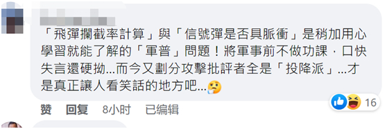 对于于北辰16日开呛台“陆军司令部”,并发誓从今开始会尽全力来监督台军,绝不留情,有岛内网友留言附和。不过,也有部分岛内网友认为,导弹拦截率与信号弹是否具有脉冲功能是稍加用心学习就能了解到的,于北辰事前不做功课,口快失言还硬拗……而今又攻击批评者全是“投降派”,这才是真正让人看笑话的地方。↓