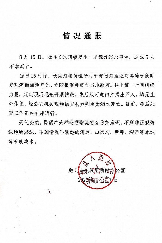 @勉县外宣 微博8月17日通报,15日长沟河镇发生一起意外溺水事件,造成5人不幸溺亡。勉县政府新闻办公室表示,天气炎热,提醒广大群众要增强安全防范意识,不到非正规游泳场所游泳,不到情况不熟悉的河道、山洪沟、塘库、沟渠等水域游泳或戏水。