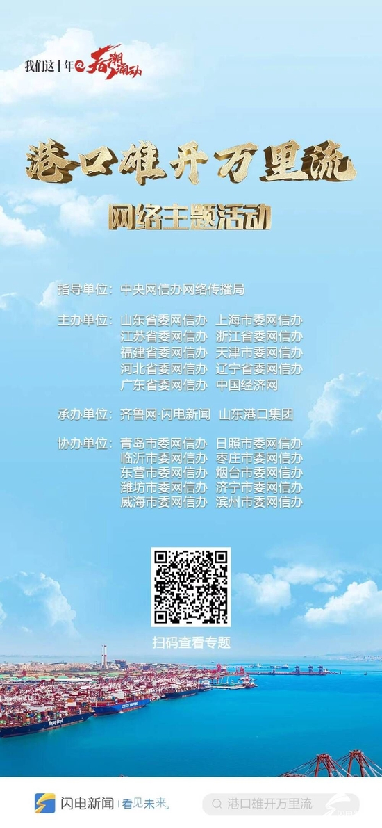 编者按:8月16日,“港口雄开万里流”网络主题活动在山东青岛启动,本次活动由中央网信办网络传播局指导,山东省委网信办、上海市委网信办、江苏省委网信办、浙江省委网信办、福建省委网信办、天津市委网信办、河北省委网信办、辽宁省委网信办、广东省委网信办、中国经济网主办,山东线活动由齐鲁网·闪电新闻、山东省港口集团承办,青岛、日照、临沂、枣庄、东营、烟台、潍坊、济宁、威海、滨州等10市党委网信办协办。