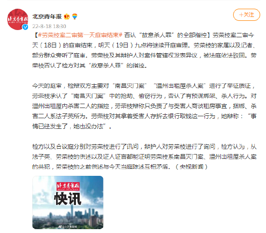 8月18日上午,劳荣枝涉嫌犯故意杀人罪、抢劫罪、绑架罪上诉案,在江西省高级人民法院进行二审。
