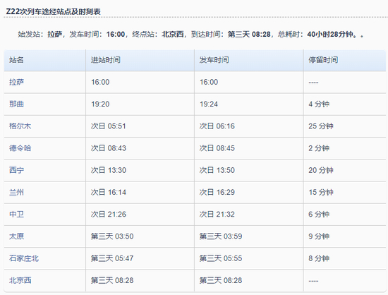 据了解,Z22次列车由西藏拉萨站开往北京西站,共有10站,全程耗时约40小时28分钟,途经多个省份。