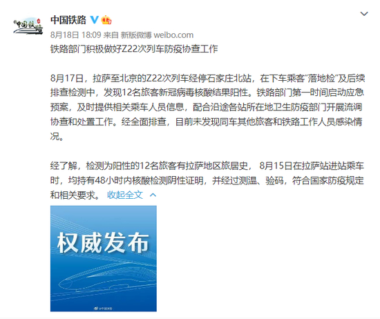 据中国国家铁路集团有限公司官方微博@中国铁路 昨日通报:8月15日在拉萨站进站乘车时,均持有48小时内核酸检测阴性证明,并经过测温、验码,符合国家防疫规定和相关要求。