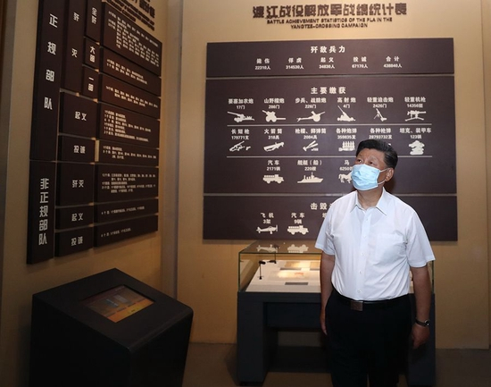 2020年8月19日,在安徽考察调研的习近平总书记走进巢湖之滨的渡江战役纪念馆,重温革命历史,缅怀革命先辈的丰功伟绩。 在“渡江战役解放军战绩统计表”前,总书记驻足凝视。