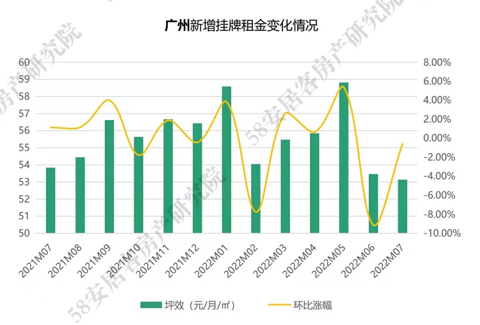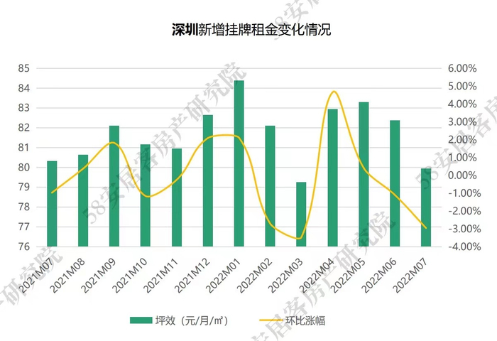 58安居客房产研究院数据显示,7月,深圳和广州新增挂牌租金水平持续回落。其中,深圳挂牌租金价格环比下跌2.95%,广州环比下跌0.59%。7月深圳的挂牌价格水平回到了今年3月,广州挂牌价格基本与上月持平。从价格反馈来看,广深租赁需求转弱。