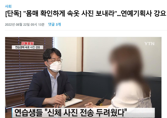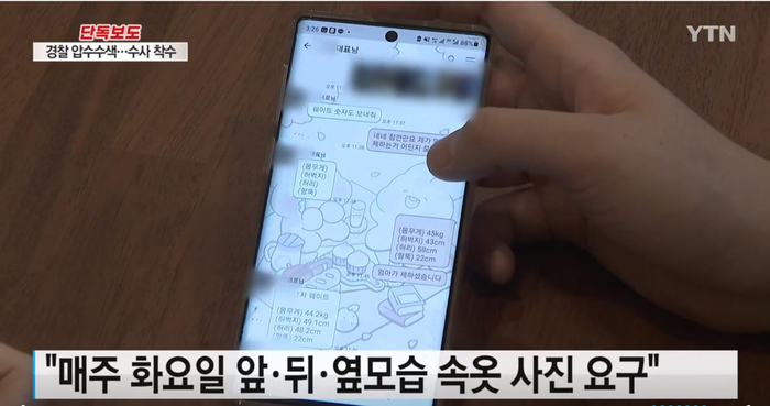 YTN电视台在对这名台湾女练习生采访时得知,这家韩国演艺经纪公司的法人代表定期在每周二要求公司所属的女练习生拍摄并发送自己只穿内衣的全身照。拍照时要求女孩们只能身着内衣,并且分前、后和侧面三个角度进行全身拍摄。同时还要求女练习生们测量自己腰部、大腿及手臂的围度,并将数据发送给他。如果女练习生不遵守规定,就会受到该法人代表的责难。从这名台湾女孩向YTN记者展示的手机聊天记录来看,女孩曾因不发送内衣照而被这名公司法人责问道:“哪有那么容易就能成为韩流偶像的?”报道还称,如果连续两周给公司法人发送身着相同颜色内衣的照片,女练习生们还会被追问照片是不是上周拍的。