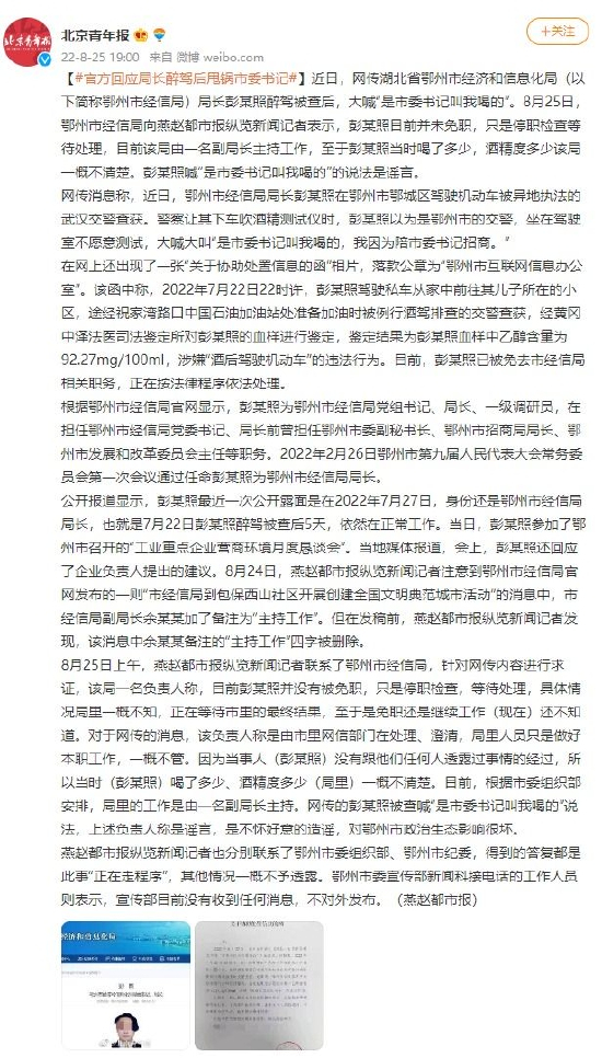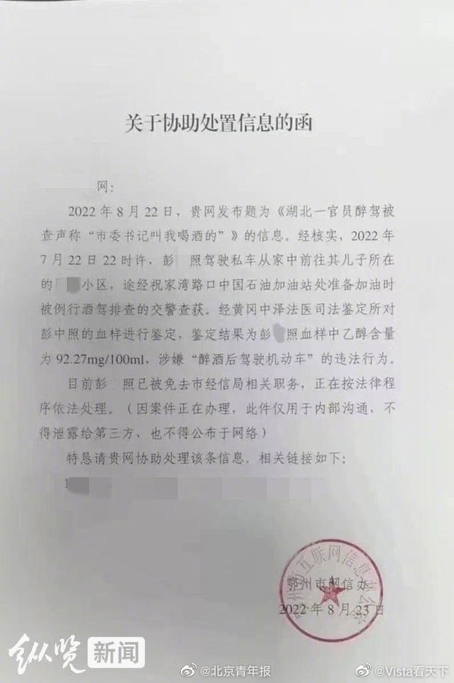 在网上还出现了一张“关于协助处置信息的函”相片,落款公章为“鄂州市互联网信息办公室”。该函中称,2022年7月22日22时许,彭某照驾驶私车从家中前往其儿子所在的小区,途经祝家湾路口中国石油加油站处准备加油时被例行酒驾排查的交警查获,经黄冈中泽法医司法鉴定所对彭某照的血样进行鉴定,鉴定结果为彭某照血样中乙醇含量为92.27mg/100ml,涉嫌“酒后驾驶机动车”的违法行为。目前,彭某照已被免去市经信局相关职务,正在按法律程序依法处理。