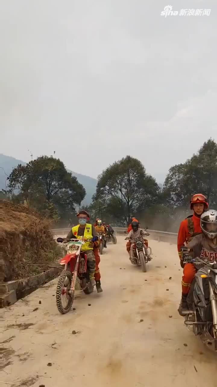 重庆北碚山火救援现场 帅气的摩托骑手与勇敢的消防员共同开进火场