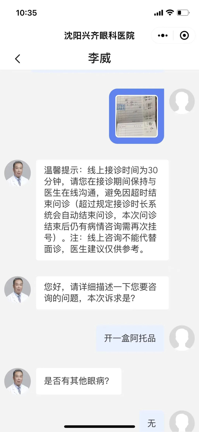 另一种就是通过互联网医院的方式:她带着孩子在北京同仁医院的眼科门诊检查后,医生会在病历上写下低浓度阿托品滴眼液的处方,张琳拿着病历在沈阳兴齐眼科医院小程序上问诊后,提供孩子三个月内的眼部检查报告即可购买。
