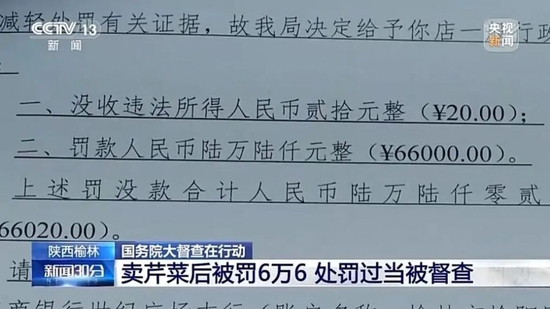 农民日报微信公号消息,据报道,近日国务院督查组在“国务院互联网+督查平台”上接到群众反映,陕西省榆林市一家个体户卖出5斤芹菜后,被市场监管部门罚款6.6万元。经督查组调查,去年10月罗某夫妇经营的蔬菜粮油店购进7斤芹菜,市场监管部门提取2斤抽样检查,剩余5斤罗某夫妇共卖出20元。一个月后,检测报告显示芹菜不合格,因罗某夫妇无法提供进货票据,已售出芹菜无法召回,处罚决定书认定罗某夫妇涉嫌经营超过食品安全标准限量食品,罚款6.6万元。该报道引发舆论广泛关注。