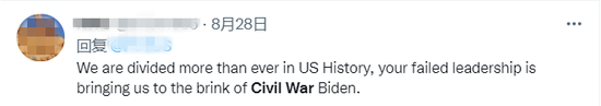 “我们分裂的程度比美国历史上任何时期都更严重,拜登,你失败的领导正在将我们带往内战的边缘。”(史赫奕 王鲁平 任丽君)