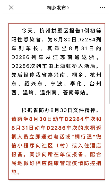 8月30日乘坐动车D2284车次的人员,请立即向所在社区(村)、单位、学校或居住的酒店报告,如实提供活动轨迹和个人健康状况,并配合做好疫情防控措施。省外来桐返桐人员需提前核查自己的杭州健康码为绿码,主动向居住地社区或入住的酒店、宾/旅馆进行报备,抵桐后24小时内做一次核酸检测,核酸结果未出具前,不前往公共场所活动,倡导进行3天3检。