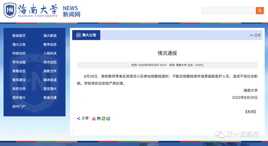 8月29日20时41分,海南大学发布情况通报称:“8月28日,我校教师季某在其居住小区参加核酸检测时,不配合核酸检测并指责威胁医护人员,造成不良社会影响。学校将依法依规严肃处理。”