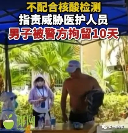 此前,有报道,一则网传视频显示,海口市一男子在核酸检测时,不配合佩戴口罩,并将所携带物品放置核酸检测桌上,被医护人员制止后指责威胁医护人员。海口警方表示,该男子已被海口警方依法作出拘留10日处罚。