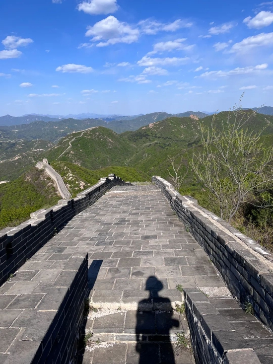 双脚踩在古长城的石堆上走,来自北方草原的风吹过我的肩膀,进入北京城。这一瞬间,让人穿越时空,连通古今。万里长城盘踞在远处连串起伏的山脊上,眼前这么大一座山,我悄悄的把肉身放在其中,兴奋的发了条朋友圈:“空山我一人,妙不可言”。