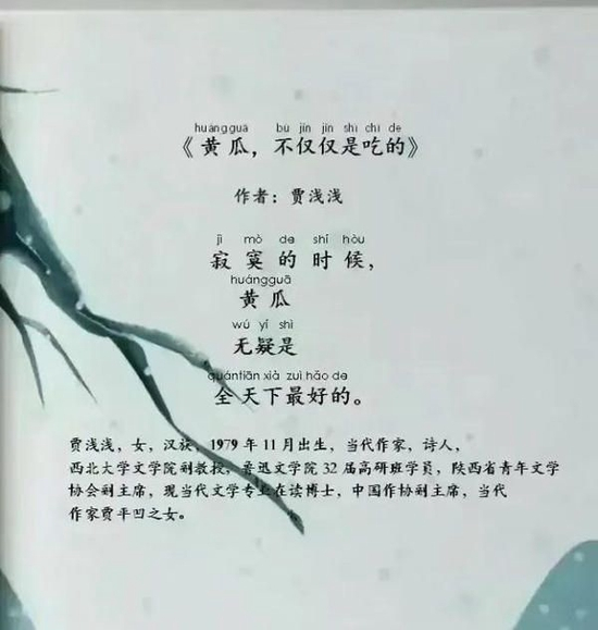 9月3日,河南省文学院专业作家赵瑜告诉顶端新闻·河南商报记者,他从权威渠道获得信息,《朗朗》可能是贾浅浅写的,而《雪天》《真香啊》《黄瓜,不仅仅是吃的》,并非贾浅浅创作。